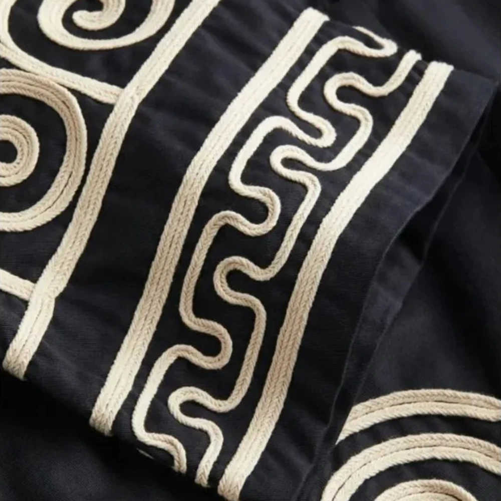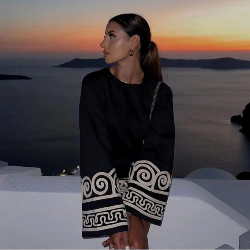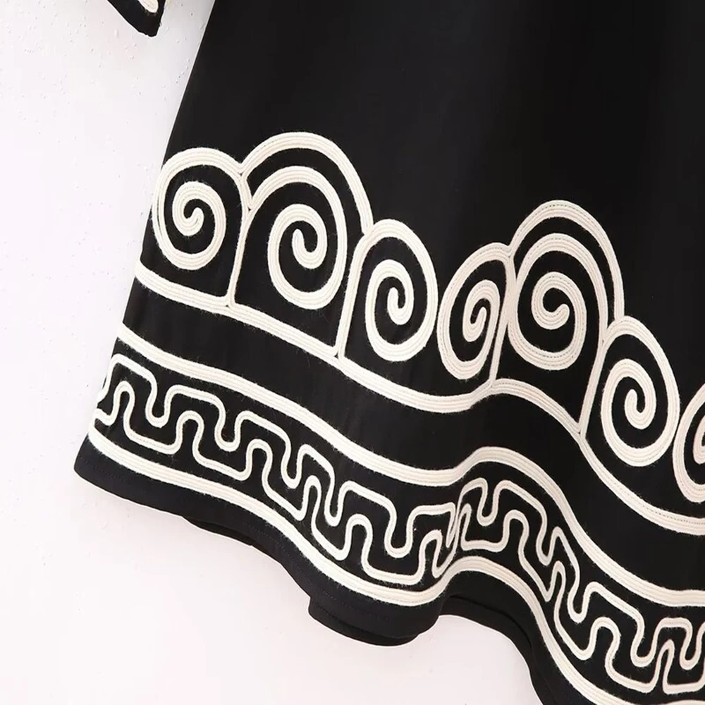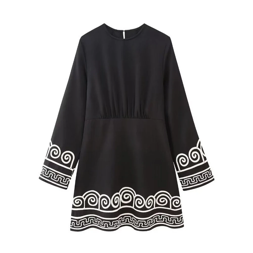 TRAFZA Women's Embroidery Patchwork Dress Long Sleeve Round Neck Tie Dress Casual Loose Commuter Holiday Travel Short Dresses